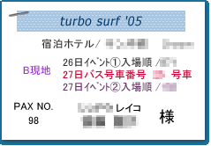 現地集合のBコースで参加。 せっかくの現地集合コースなので、正規の日程よりも前後に若干余裕を持った沖縄滞在。 仕事を定時で終わらせて空港へ直行。台風の様子を気にしつつも、東京・沖縄とも問題ない離着陸。 那覇着。 外は暗く、すごい湿度。友達は口々に沖縄に来た実感がないと言っていたけれど、私は既に実感ありまくり。 それどころか、関西弁を話している一般客を見て、 「(…日本人だらけだなぁ)」 …って、外国にでも来たんじゃないかって勘違いしたようにワクワク。ここ日本ですから…。 前回progressツアーで来た時は工事中だった“ゆいレール”に乗り、宿泊地方面へ。ここでも友達は、「お台場みたい」…と。いや…確かにゆりかもめっぽいけども! この日はTURBO SURFではないホテルに1泊。 8/25(木) 早起きしてシュノーケリングに。 起きてテレビを付けると、台風直撃中の本土の映像が。 窓の外に広がるいい天気を見るとまるで余所の国の出来事であるかのようだけど、 まだ沖縄に来ていない友達を思うと他人事ではなく。 目的地到着。 シュノーケリングは1回だけハワイでチラッとやってみたことはあるけれど、 ウエットスーツ着て深いところでやったことはないので初めてのようなもの。 割と好みのビジュアルなインストラクター(現地の人かと思ったら神奈川出身だそう)に説明を受け、いざ海へ! すーっごく天気が良くて、徐々に進んでいくと数十メートル?下まで見える。スゴイ。 自分がいるのは水面なのに、深いところにいるような錯覚。 途中でダイビングしている人も見えて、怖そうで興味を持っていなかったダイビングも、ちょっといいかも…と思える。 しかしその後、波に酔いグッタリしてしまう始末…; 沖縄来て早々にみんなゴメン。 でも最後の最後で酔っただけなので、シュノーケリング自体は問題なく楽しんできました。 もっと慣れたいなーと思いつつ、また酔ったら怖いなと。あぁ。 途中、ブルーシールのお店でアイスを食べて復活。ウマイ、ウマすぎる…。沖縄滞在中、毎日食べるぞ!■15時チェックイン 短パンにビーチサンダル、いかにも海帰りな姿でTURBO SURF指定ホテルへ。 ロビーの一角に作られたTURBO SURFツアーデスクにてネームカード(?)や注意事項の書かれた紙を渡され、 21時に再度集合とのこと。(余談ですが、私の宿泊ホテル担当のスタッフはハワイの時にもお世話になった方でした。) 渡されたネームカードに書かれていたのは…